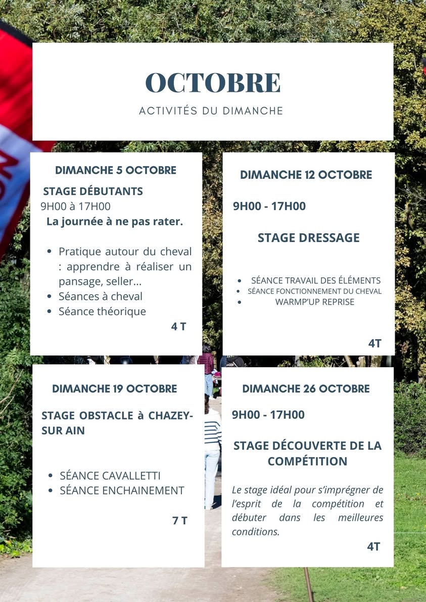À chaque vacances scolaires, des stages ouverts à tous niveaux allient progression et convivialité.